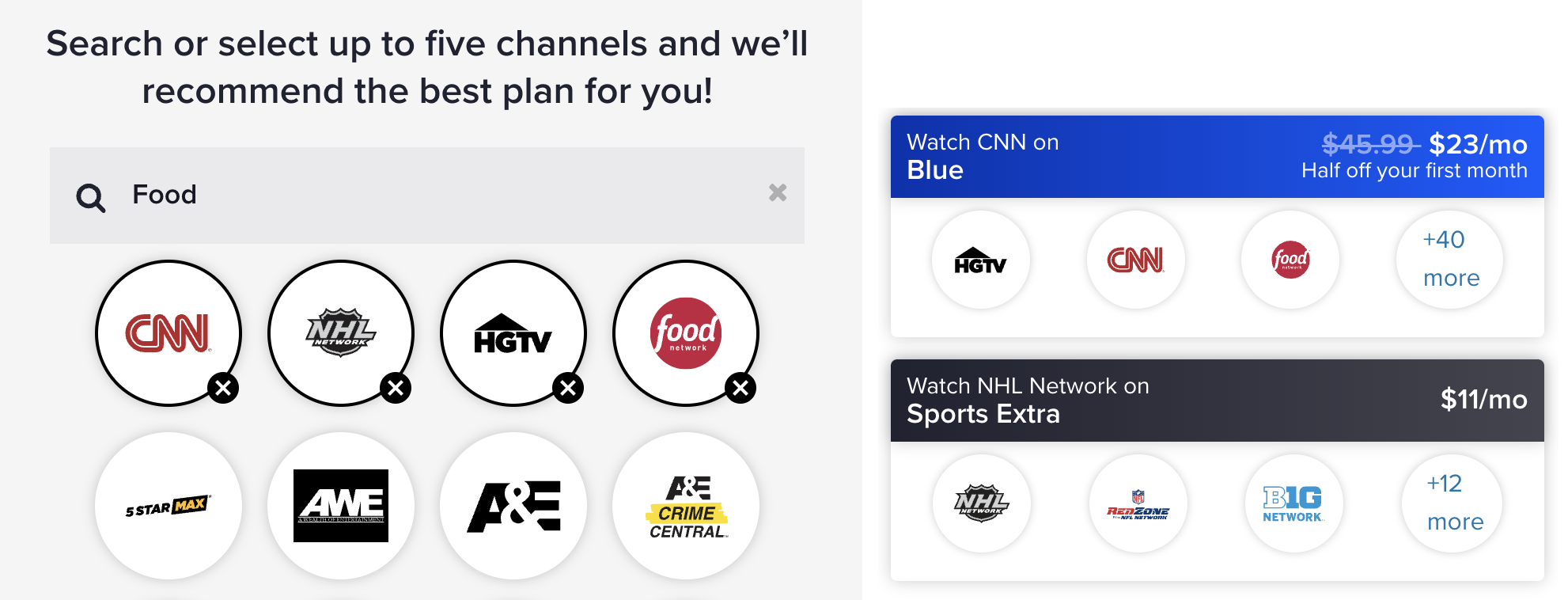 Our user experience decision was to “invert the pyramid” and allow customers to shop for the enterainment they know, in this case by channels. The feature allows customers to select their favorite channels, and then use that customer-driven combination to recommend a Sling plan. The logic also applies a lowest-cost calculation, consistent with the brand’s value proposition.